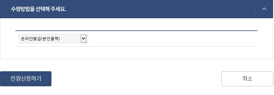 수령방법으로는 만약 본인이 직접발급하여 출력을 한다고하면 온라인발급(본인출력) 항목 그대로 두시고 민원신청하기를 눌러 민원신청이되면 직접 프린트를 이용하여 발급하시면됩니다.