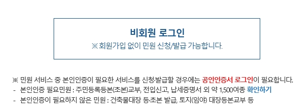 그러나 주민등록등본, 초본, 전입신고, 납세증명서등의 서류들은 본인인증이 필수이기때문에 비회원으로 로그인하여 민원신청을하여도 공인인증서로 로그인을 하라고나오게되며, 비회원으로 민원 신청이나 발급은 불가능하니 참고해주시기바랍니다.