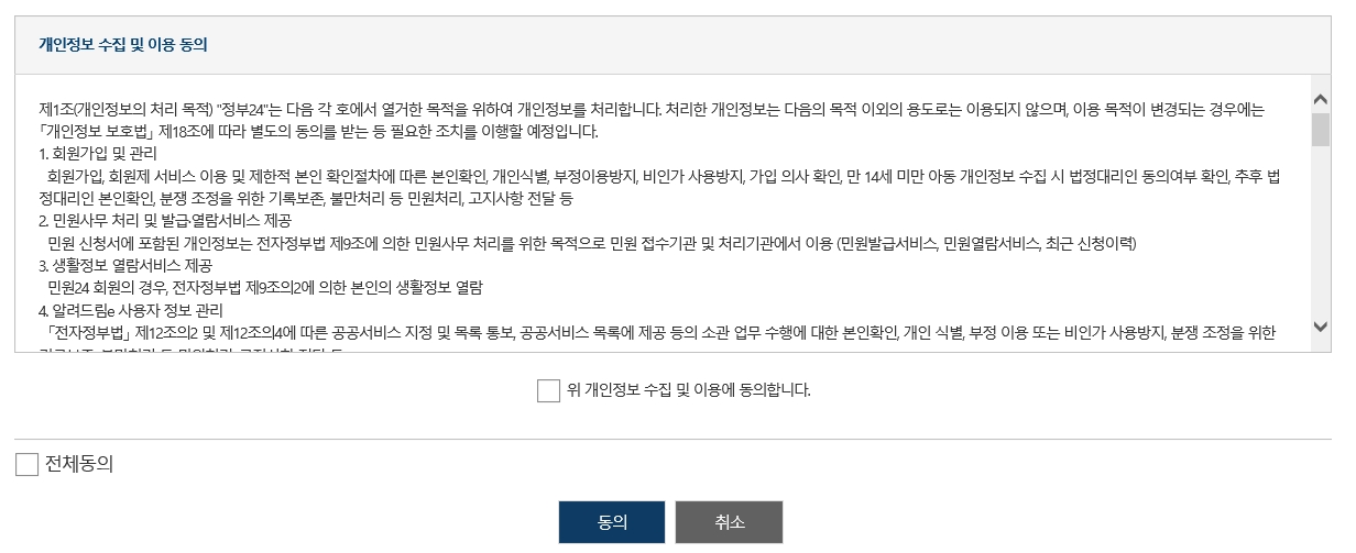 공인인증서로 로그인후 민원신청을 할시 이용약관 및 개인정보 수집 재동의에 동의를 체크하여 다음으로 넘어가줍니다.